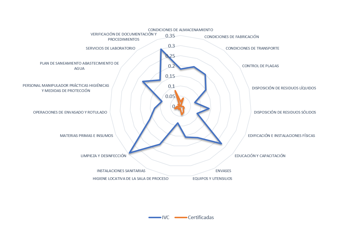 Resumen: El sector manufacturero de bebidas alcohólicas en Colombia se enfrenta a un reto en cuanto a la mejora de sus procesos, esto acorde a lo dispuesto en el Decreto 1686 de 2012, que declaró la obligatoriedad del certificado en buenas prácticas de manufactura, con un plazo inicial de dos años para su cumplimiento. Es así como el plazo establecido ha sufrido varias modificaciones dadas por los Decretos 1506 de 2014, 262 de 2017 y 216 de 2019, esto debido a los bajos indicadores de cumplimiento del sector manufacturero, principalmente, en los micro y pequeños establecimientos productores. Son diversas las dificultades presentes, entre las que se identifican las de carácter técnico y reglamentario, manejo documental, salud pública, rentístico, ilegalidad, acceso de mercados, económico o financiero. Caracterizar el nivel de cumplimiento para las micro y pequeñas empresas productoras de bebidas alcohólicas permite identificar las mayores brechas y posibilita la construcción de un instrumento técnico. Así, se diseñó una guía con una estructura de evaluación que profundiza en la verificacion de los diferentes requisitos sanitarios, acompañada de componentes de apoyo tecnico, evaluacion, y ponderacion basado en un enfoque de riesgo. De esta manera, se observó cómo las variables que guardan una relación con la gestión del sistema y el seguimiento de las acciones requieren de una mayor atención, esto a partir de los porcentajes de incumplimiento.