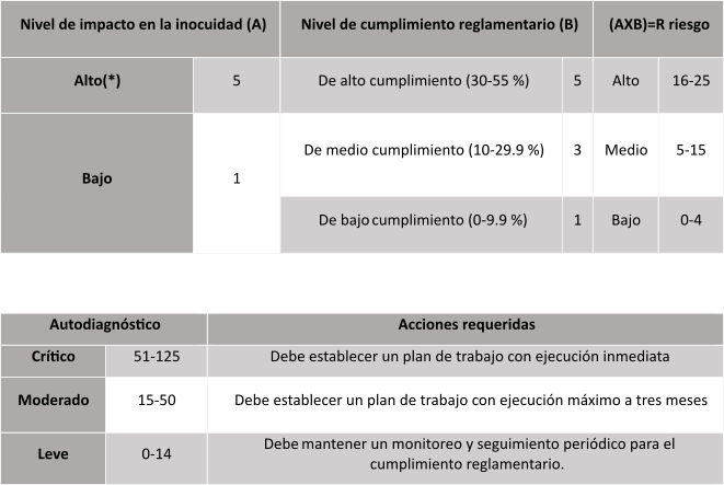 Dentro de la guía se presentan dos matrices de riesgo (ver tabla 1), la primera de ellas relaciona la ponderación del nivel de impacto en la salud y la segunda, el nivel de incumplimiento de requisitos sanitarios de las plantas. Ambas se conjugan para establecer el riesgo y servir de factor de autoevaluación para realizar el autodiagnóstico de la planta. Las matrices finales, con enfoque de riesgo, se tipifican en rangos y colores, estas características buscan facilitar el entendimiento y aplicación sencilla al interesado.
