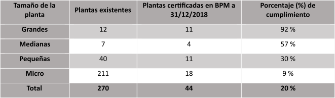 Con respecto al estado del cumplimiento del requisito de certificación BPM para las plantas del censo, específicamente, se observó (ver tabla 3):