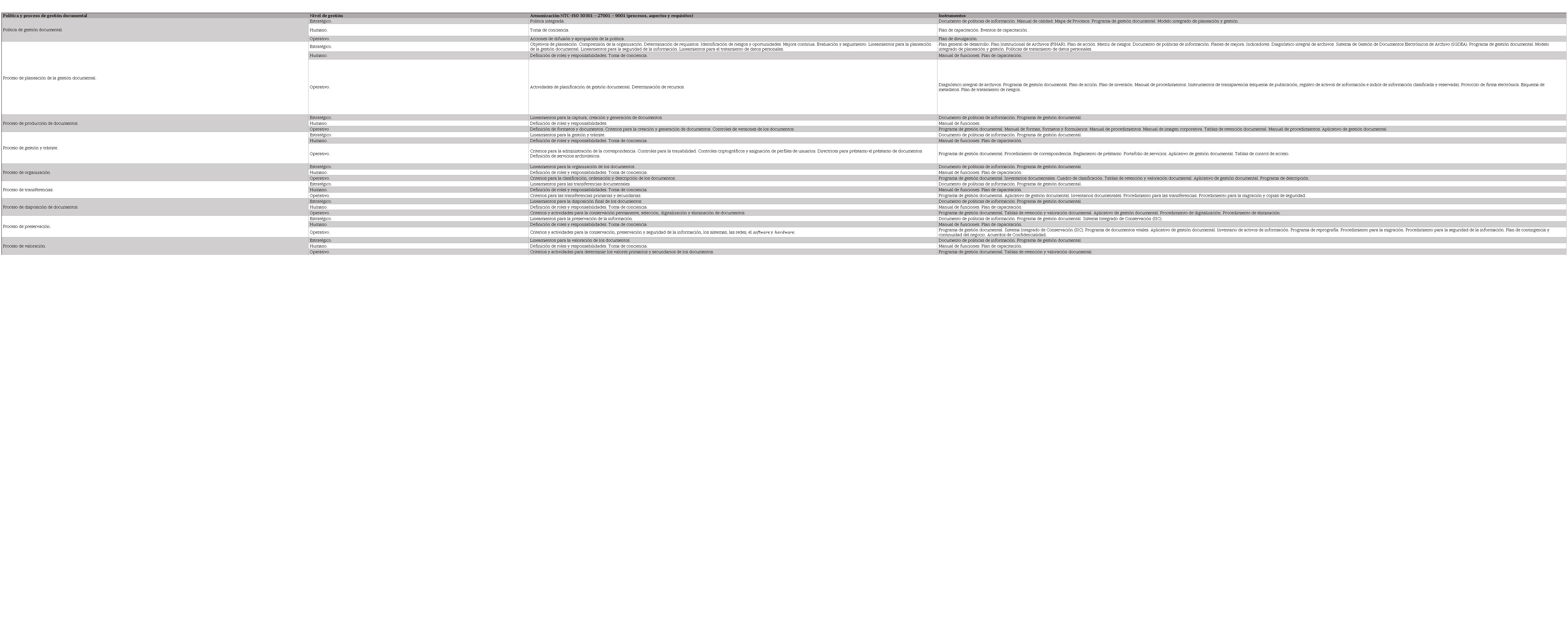 La fase de diagnóstico se llevó a cabo a partir de una herramienta diseñada por una matriz de Excel, que refleja el estado actual del nivel de cumplimiento o grado de implementación de los procesos de gestión documental en la institución, establecidos en el Artículo 2.8.2.5.9 del Decreto 1080 de 2015, las actividades de los procesos de gestión documental, señalados en la guía para la implementación de un programa de gestión documental del Archivo General de la Nación (AGN), las actividades generales de los procesos y controles descritos en las NTC-ISO 30301 y 27001, así como los requisitos generales de información documentada de la NTC-ISO 9001.