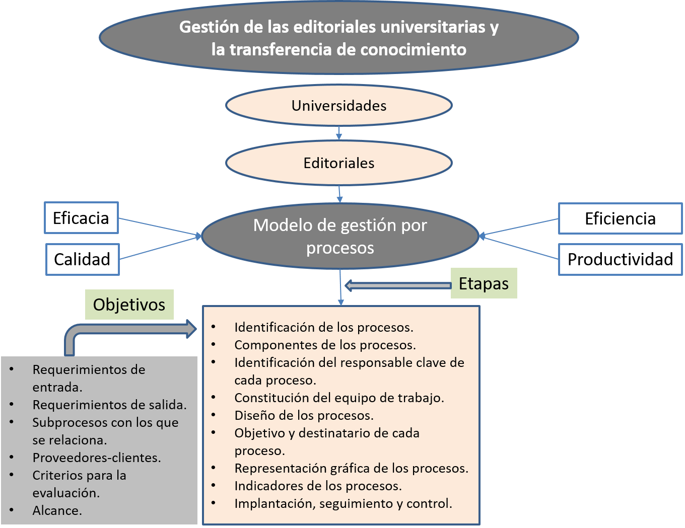 Para establecer la transferencia estratégica del conocimiento, se acude a la metodología de la gestión por procesos estructurada para las editoriales universitarias, de donde se extraen nueve etapas comunes. En la figura 2 se muestra el mapa conceptual de esa gestión por procesos, en la transferencia de conocimiento. A continuación, las etapas: