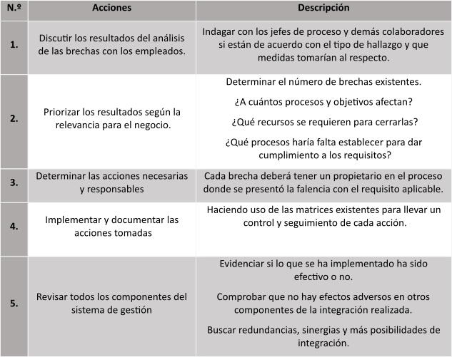 Las brechas encontradas serán consideras como fallas en la comprensión al momento de aplicar un requisito normativo y, para ello, deberán identificarse qué tipo de debilidades sistémicas se están relacionando con problemas organizacionales más amplios, como las interrelaciones entre los procesos insuficientemente definidas o ausencia de procesos que aborden los requisitos de las normas; así mismo, también pueden existir oportunidades de mejora relacionadas con el uso integrado de las normas. Los pasos a seguir para el cierre de brechas pueden incluir: