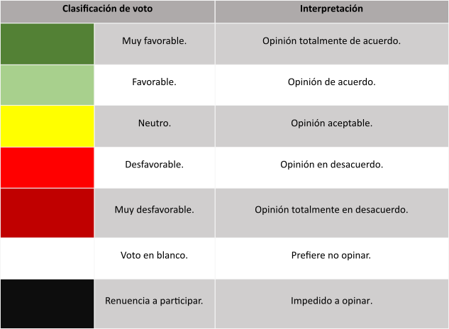 Como se mencionó anteriormente, la herramienta implementada fue el ábaco de Régnier, que consta de una gama de colores alineados según la convención internacional adoptada para los colores del semáforo. Estos colores indican la opinión de cada experto respecto a las afirmaciones realizadas con base en los modelos propuestos. A nivel general, los colores van desde el verde hasta el negro, desde las opiniones positivas, pasando a las posiciones neutras, luego opiniones negativas y, por último, condicionales como el voto en blanco y renuencia a participar. Así, tienen el siguiente significado descrito en la tabla 10: