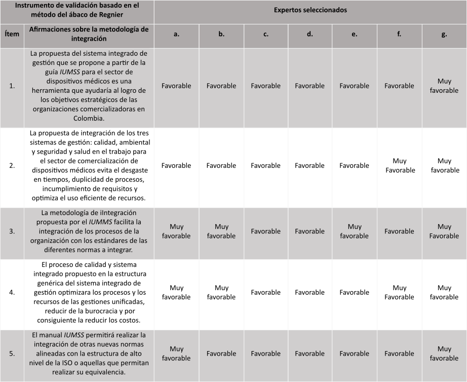Finalmente, se realizó la validación de la metodología de integración de las normas a través del método del ábaco de Régnier, el cual tiene como objetivo interrogar a expertos en un tema específico y tratar sus respuestas en tiempo real o por vía remota a partir de una escala de colores. Como todos los métodos compuestos por expertos, estos se destinan a reducir la incertidumbre, confrontar un punto de vista grupal y, a la vez, tomar conciencia de la mayor o menor variedad de opiniones (Blogs, 2013). Para aplicar dicha metodología, se establecieron cuatro etapas, las cuales se describen en la tabla 1, a continuación: