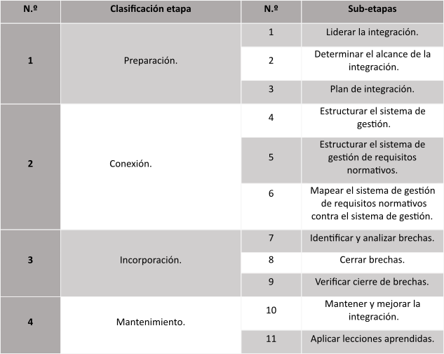 En la integración de sistemas de gestión, se deberá considerar lo descrito por Wilkinson y Dale (1999); y Karapetrovic y Jonker (2003). En sus trabajos se resalta la necesidad de definir y establecer una metodológica genérica o aplicable a todo tipo de organización que permita agrupar los elementos comunes entre los diferentes sistemas a integrar, flexibilidad para satisfacer los requerimientos normativos, compatibilidad con el ciclo PHVA y enfoques sistémicos. Además, se debe tener en cuenta que, si otras actividades y operaciones no pueden integrarse, deberán ser rediseñadas de manera que se vuelvan sinérgicas con las funciones que han sido integradas (Nunhes et ál., 2017).