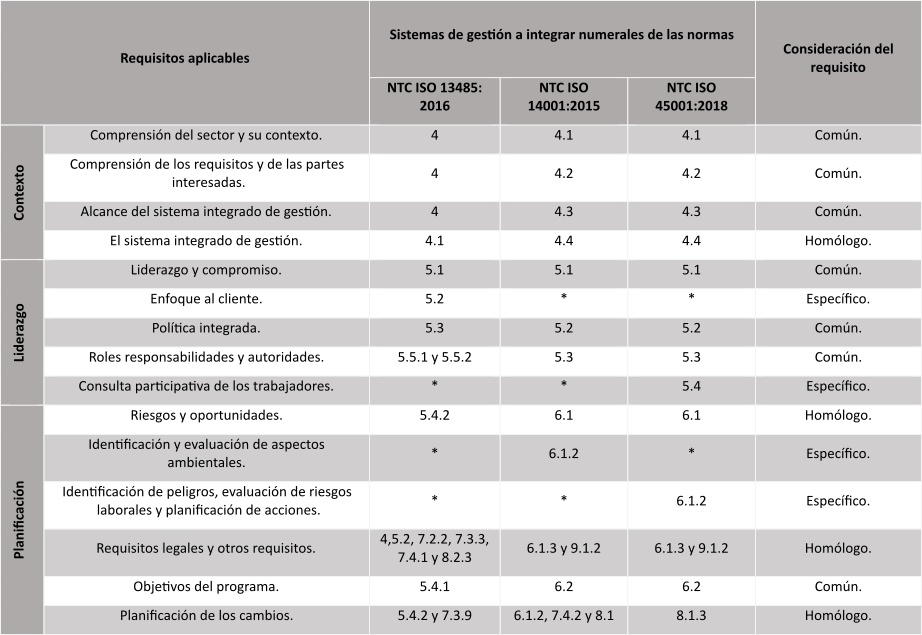 Para cumplir con esta subetapa de la metodología de integración, se realizó una comparación entre las tres normas a integrar a través de una matriz que se muestra parcialmente en la tabla 5. En ella se tomaron todos los requisitos aplicables de cada norma y se identificaron los puntos en común (los requisitos similares que permiten la integración), los homólogos (los requisitos que tienen puntos similares solo en dos de los tres esquemas normativos) y específicos (los requisitos relacionados directamente a una norma en particular). Estos últimos deben ser armonizados dentro del sistema integrado de gestión (ver tabla 5).