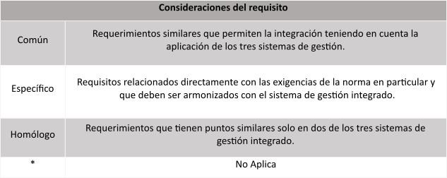 Para dar cumplimiento a esta subetapa del proceso de integración, se tuvieron en cuenta los requisitos comunes, homólogos y específicos reagrupados en una nueva matriz (ver tabla 6), la cual se muestra parcialmente. En la columna vertical de la izquierda se ubicaron los procesos que hipotéticamente podrían tener una organización y los subprocesos más relevantes identificados también de manera genérica (Calso Morales y Álvarez, 2018) para ver las consideraciones del requisito (ver tabla 7). En la fila horizontal en la parte superior se representan las cláusulas que contienen los requisitos de las normas y se detallan los numerales correspondientes a cada norma. Seguido a eso, se analizó el impacto de cada uno de los requisitos sobre los procesos con las preguntas sugeridas por el IUMMS dadas a continuación:
