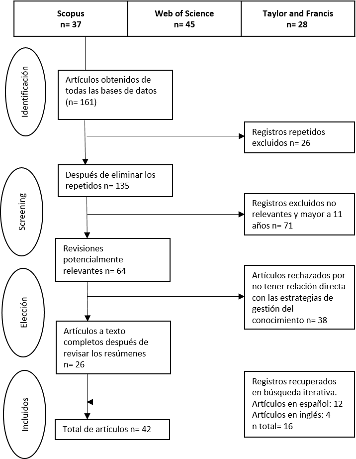 La búsqueda bibliográfica arrojó 161 referencias que se revisaron para la selección e inclusión de los estudios, según las rutas especificas citadas anteriormente. Bajo los criterios de selección como registros repetidos excluidos, años de estudio no mayor a 11 años y número de artículos rechazados por no tener relación directa con las palabras claves de la investigación, se obtuvo la revisión de 26 documentos completos y adicional se tuvieron en cuenta 16 artículos de literatura gris, para un total de 42 artículos base incluidos. Estos se analizaron para determinar las estrategias y métodos de GC, creación del conocimiento y transferencia del conocimiento.