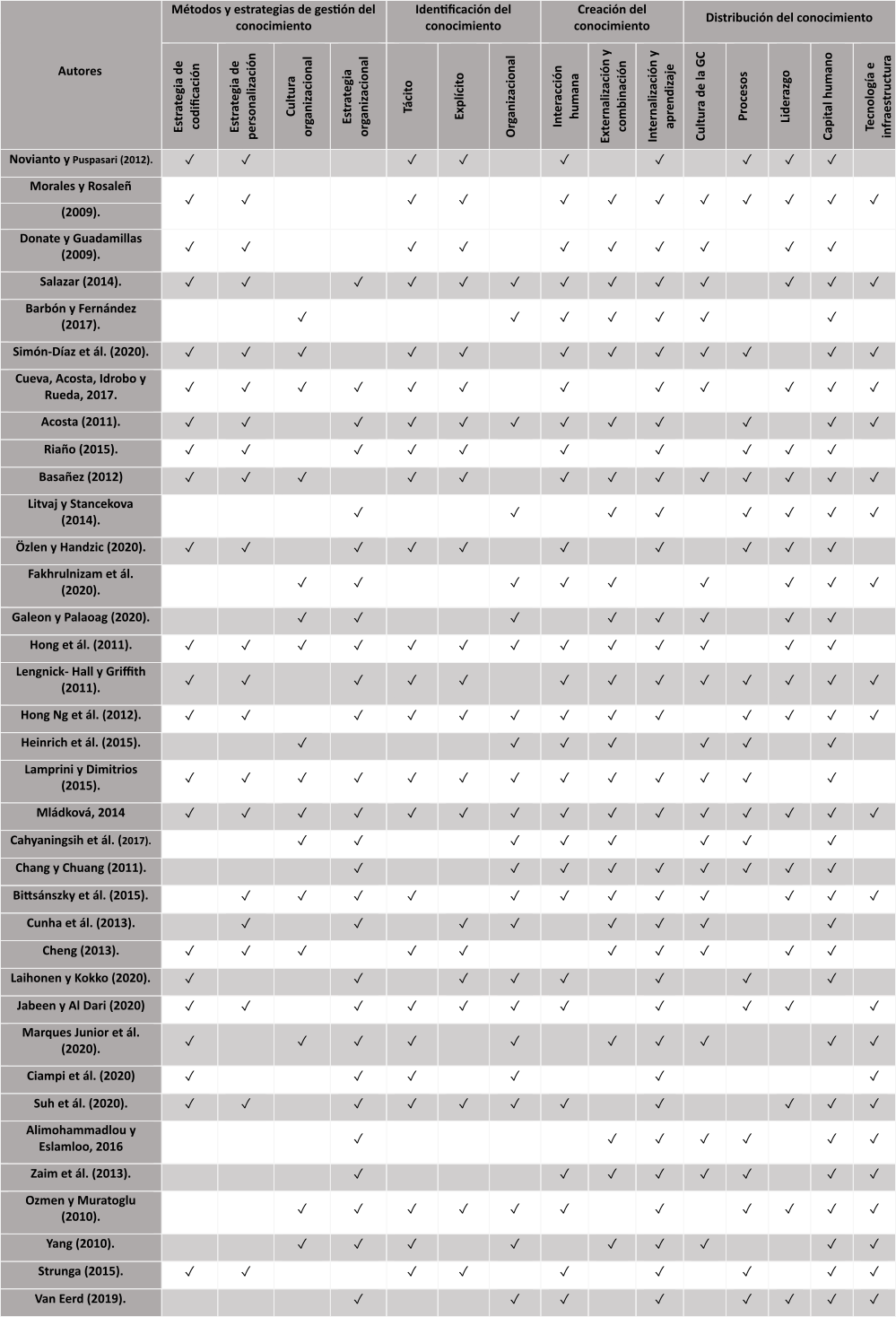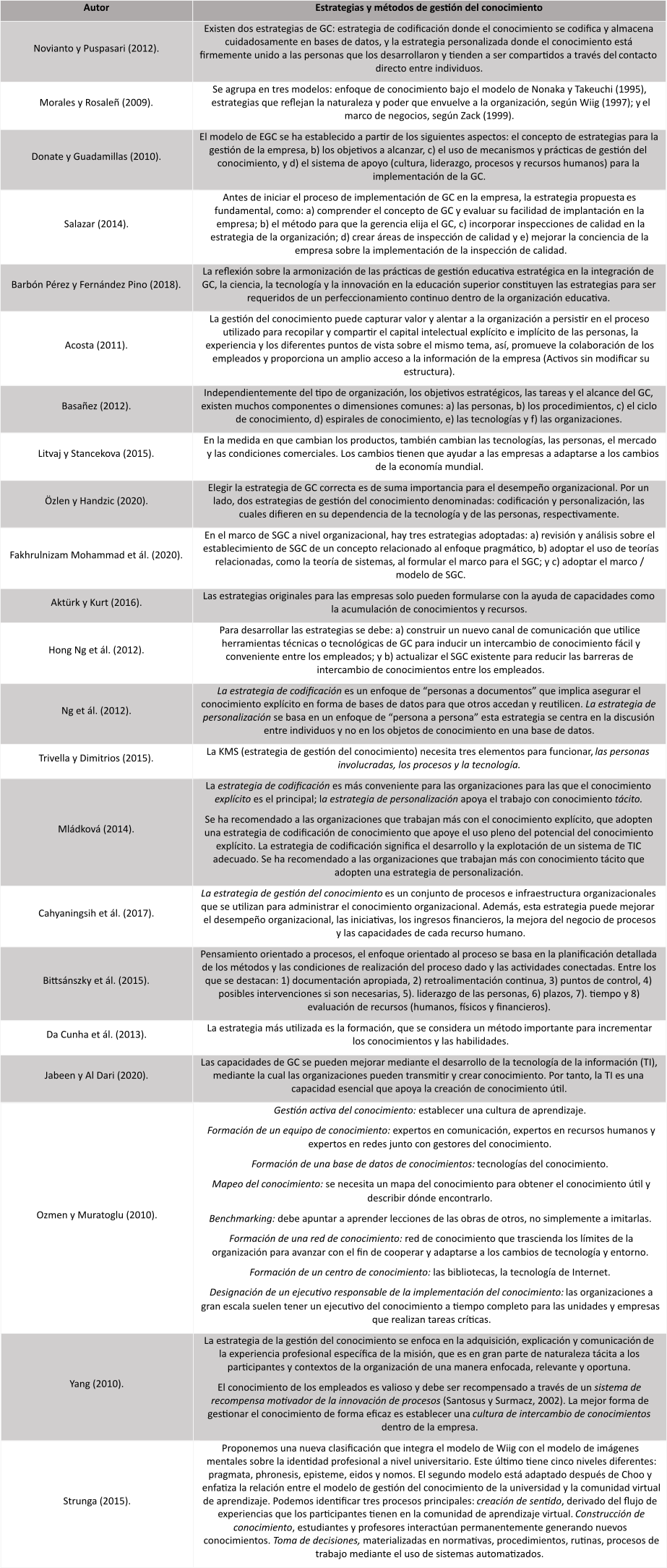 Donate y Guadamillas (2010) analizan la forma en que la empresa desarrolla e implementa su estrategia GC desde un enfoque basado en el conocimiento. Específicamente, se trata de explorar si existe un modelo de estrategias de gestión del conocimiento (EGC) específico basado en el establecimiento de objetivos, las herramientas de GC utilizadas y el grado de énfasis en ciertos factores estratégicos de implementación. Por otra parte, Morales y Rosaleñ (2009) logran identificar y clasificar varios EGC existentes y procesos de planificación estratégica para pequeñas y medianas empresas; y buscar concretar con éxito el desarrollo de la GC en la organización.
