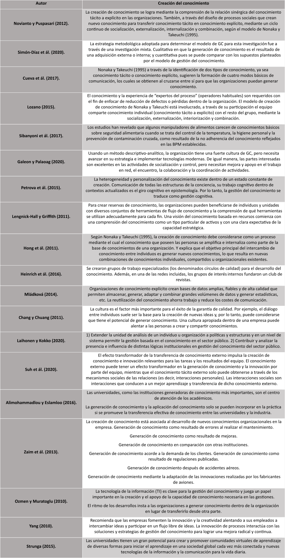 La creación o adquisición de nuevo conocimiento se logra a través de medios que proporcionan conocimientos que no se tenían o no se encontraban disponibles en la organización. Algunas actividades para la adquisición del conocimiento incluyen la innovación, investigación, lecciones aprendidas, adquisición de conocimiento de fuentes externas, retroalimentación de los procesos (Icontec, 2019). De la misma forma, algunas investigaciones recomiendan que las empresas fomenten la innovación y la creatividad alentando a sus empleados a intercambiar ideas y participar en un flujo libre de conocimiento. De acuerdo con Simón-Díaz et al. (2020), la capacitación y la educación son pilares fundamentales para la creación del conocimiento; la creación del mismo está asociada al desarrollo de nuevos conocimientos organizacionales en la empresa, de esta forma la generación de conocimiento se da como resultado de errores, como resultado de mejoras, al compararse con otras organizaciones, y también según las necesidades de los clientes (Zaim et ál., 2013).