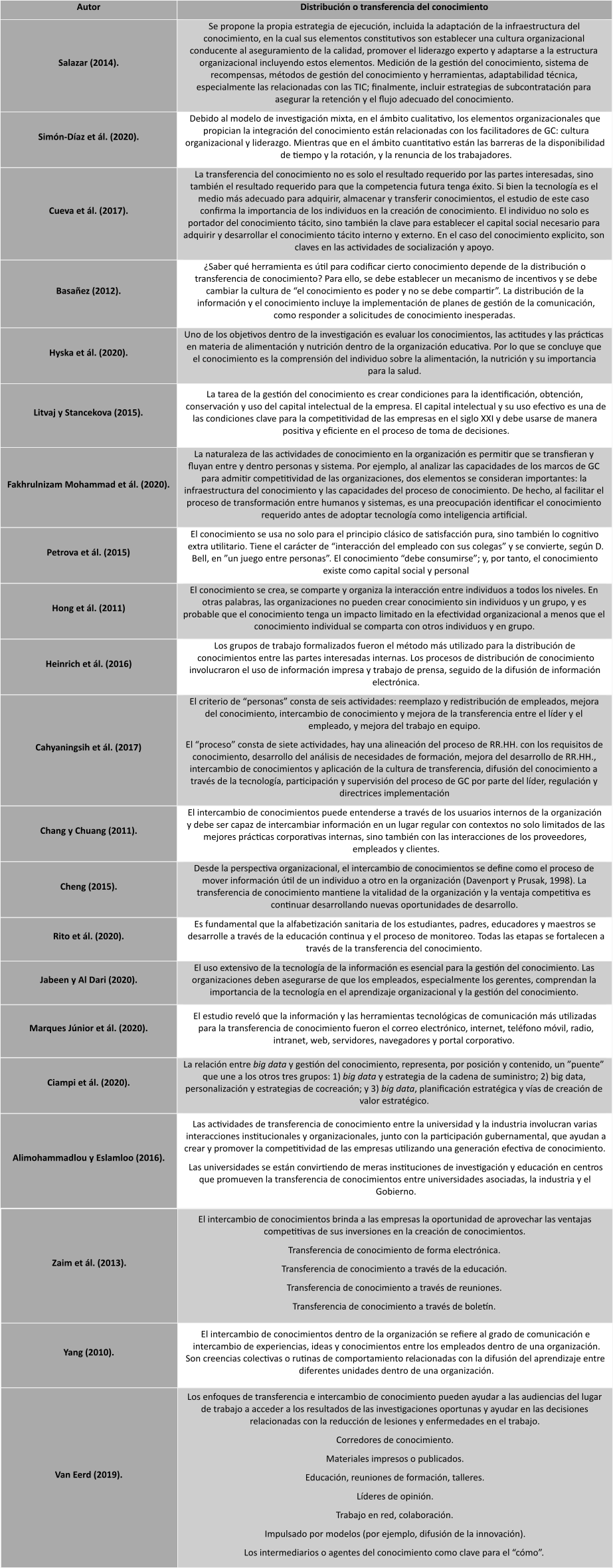 La transferencia de conocimiento incluye la interacción humana, a través de conversaciones e interacción entre individuos, equipos de trabajo y en toda la organización. Entre los factores que contribuyen a la gestión del conocimiento, están: capital humano, los procesos como actividades de conocimiento definidas, la tecnología e infraestructura, la gobernanza o liderazgo y la cultura del conocimiento (Icontec, 2019). Según Zaim et ál. (2013), hay diferentes formas para transferir el conocimiento, las cuales son: transferencia de conocimiento de forma electrónica, educación, reuniones y boletines.