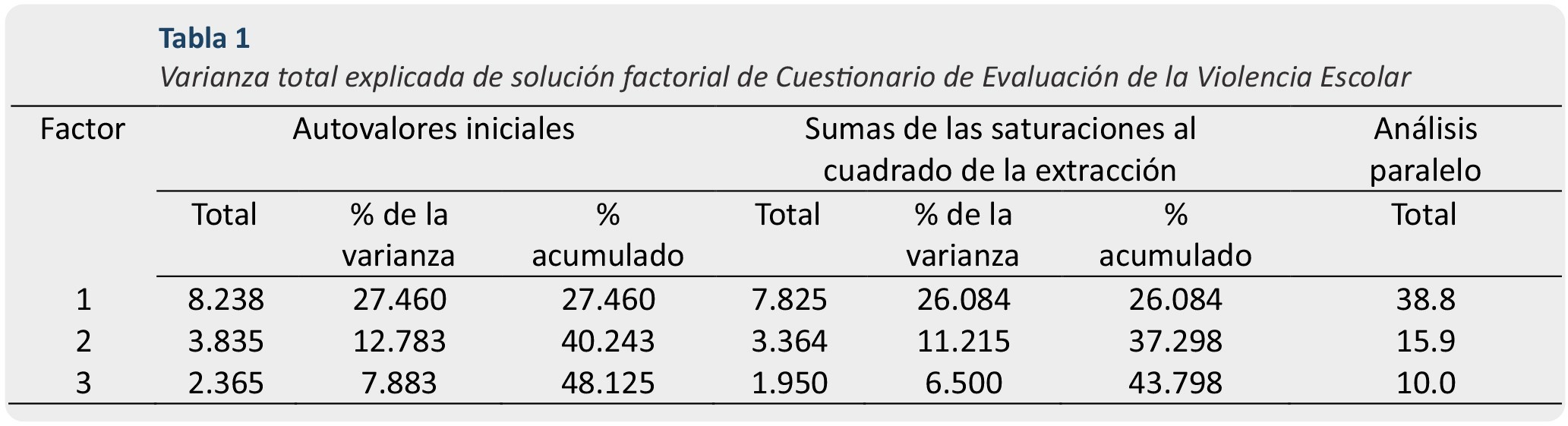 Se obtuvo una solución factorial de tres dimensiones, que corresponden a la propuesta de la estructura conceptual del instrumento de Albaladejo-Blázquez, Ferrer-Cascales, Reig-Ferrer, & Fernández-Pascual (2013). La varianza total explicada fue de 43.79%. Se utilizó el método de Mínimos Cuadrados Generalizados, se aplicaron cuatro criterios para determinar el número de factores a extraer, el primero fue el de Káiser, que marca para la selección de los factores autovalores o valores propios mayores a la unidad, el segundo fue el criterio de Cattell del punto de inflexión de la curva, el tercero fue el modelo hipotético propuesto en el instrumento, esto para dar claridad y facilidad de interpretación a los factores, evitando el uso de un único criterio o regla para la selección (Lloret-Segura, Ferreres-Traver, Hernández-Baeza, & Tomás-Marco, 2014), el cuarto fue el Análisis Paralelo de Horn (1967 como se citó en Lorenzo-Seva, Timmerman & Kiers, 2011), mismo que recomendó una estructura de tres factores. Se utilizó una rotación oblicua con el método de Normalización Oblimin con Káiser, la rotación permitió tener una solución más clara y simple, atendiendo a las recomendaciones de estudios que aconsejan su uso (Fabrigar et al., 1999; Finch, 2006; Henson y Roberts, 2006; Matsunaga, 2010; Park et al., 2002; Preacher y MacCallum, 2003 como se citó en Lloret-Segura et al., 2014).