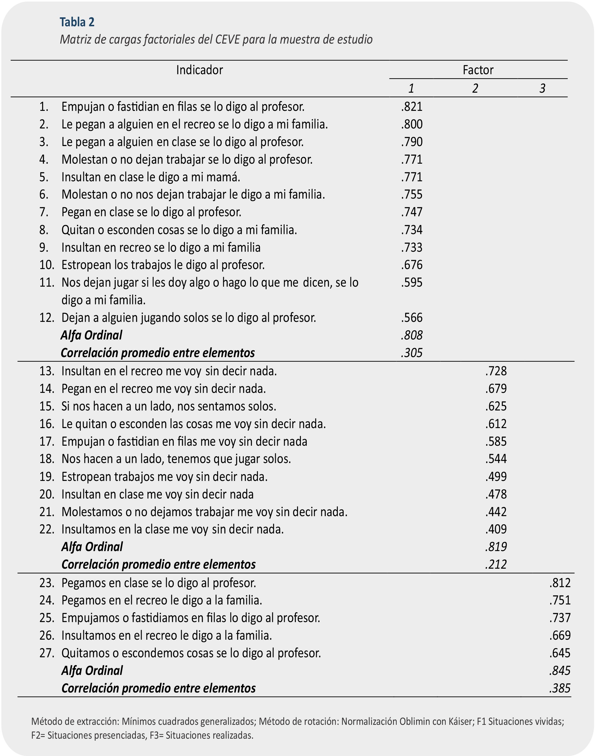 Los resultados demuestran consistencia con los estudios previos de Albaladejo-Blázquez et al (2013), en lo que corresponde a la estructura factorial inicial del CEVEIP, definida por tres factores: situaciones vividas, presenciadas y realizadas. Para el caso de la muestra obtenida del norte de México, las situaciones vividas obtuvieron una mayor varianza explicada, lo que implica un mayor peso e importancia en la definición de la violencia escolar a través del instrumento utilizado, en el caso del estudio citado, el factor con mayor carga fueron las situaciones presenciadas.