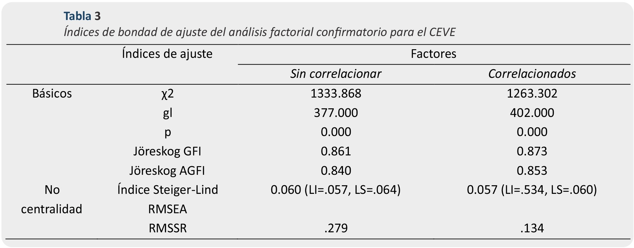 El modelo propuesto en el instrumento demostró un mejor ajuste con los factores correlacionados, el valor de la RMSEA fue de .057, aunque el coeficiente no fue de muy buen ajuste, cumple con el mínimo aceptable para este indicador, los valores de los Índices de Bondad de Ajuste de Jöreskog fueron cercanos a .90.