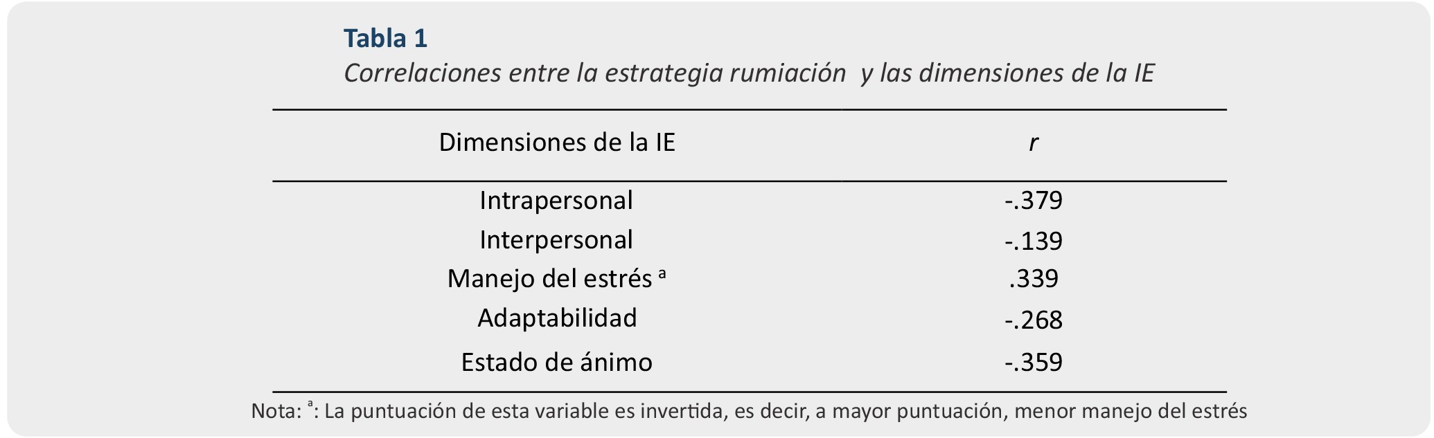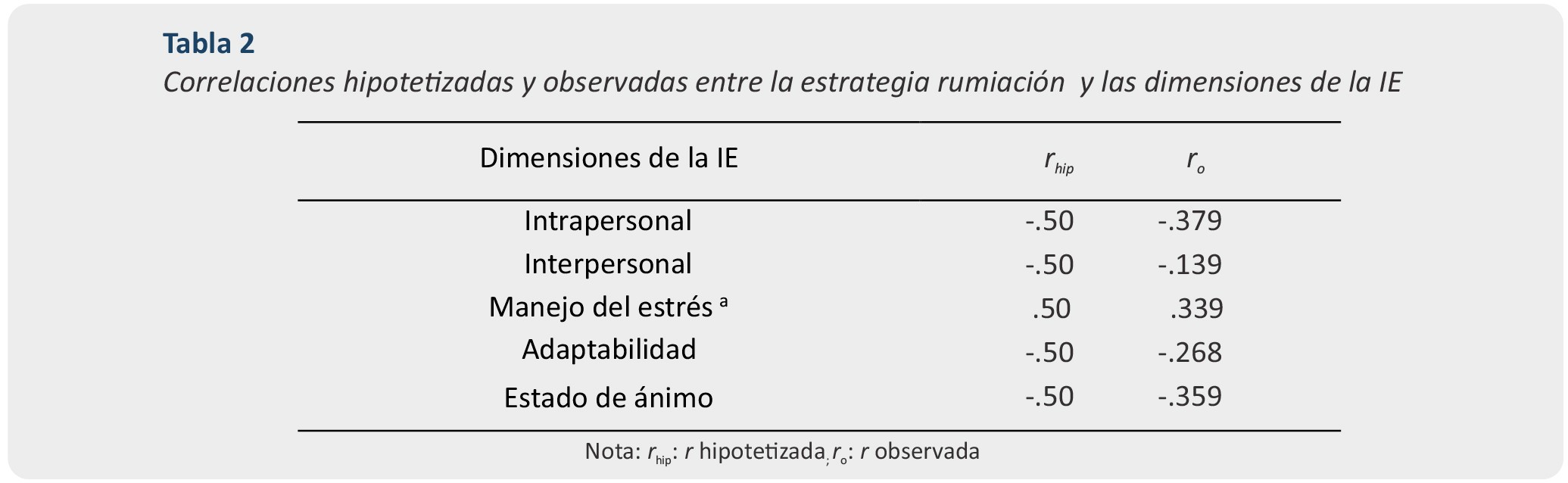 En este caso, y observando la magnitud de las correlaciones podría indicarse que, en efecto, la estrategia rumiación posee una relación inversa y significativa con la IE (> .20; Ferguson, 2009)III. Sin embargo, es necesario un indicador cuantitativo que permita dilucidar el grado de relación de esa estrategia con la IE como constructo general. Para estos fines, los fundamentos y aplicación del índice Dm (Taras, & Kline, 2010) son de utilidad.