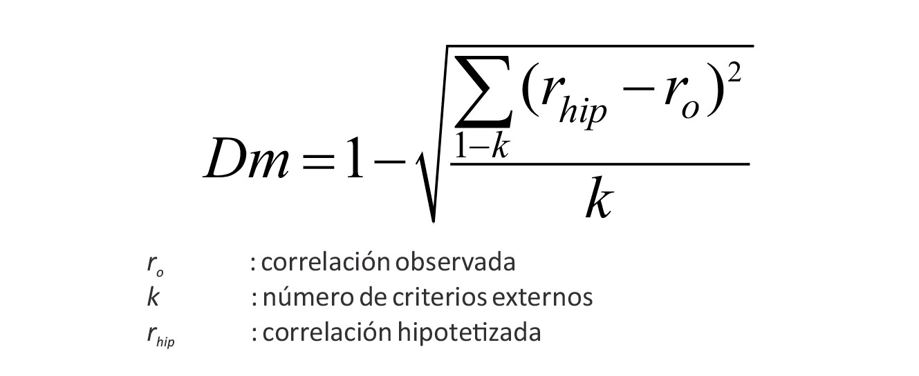 La aplicación del Dm en estudios psicométricos se orienta a la descripción del grado de asociación conjunta entre un ítem (proveniente de autoinformes) y diversos criterios externos teóricamente relevantes. Esto indica que los ítems se correlacionan con otras medidas con las cuales se establece una hipótesis relacional (p.e., rhip = .50), la cual se compara de forma individual con cada correlación observada (p.e., ro = .30), obteniendo una discrepancia promedio entre lo esperado y observado (Taras, & Kline, 2010). La expresión matemática es:
