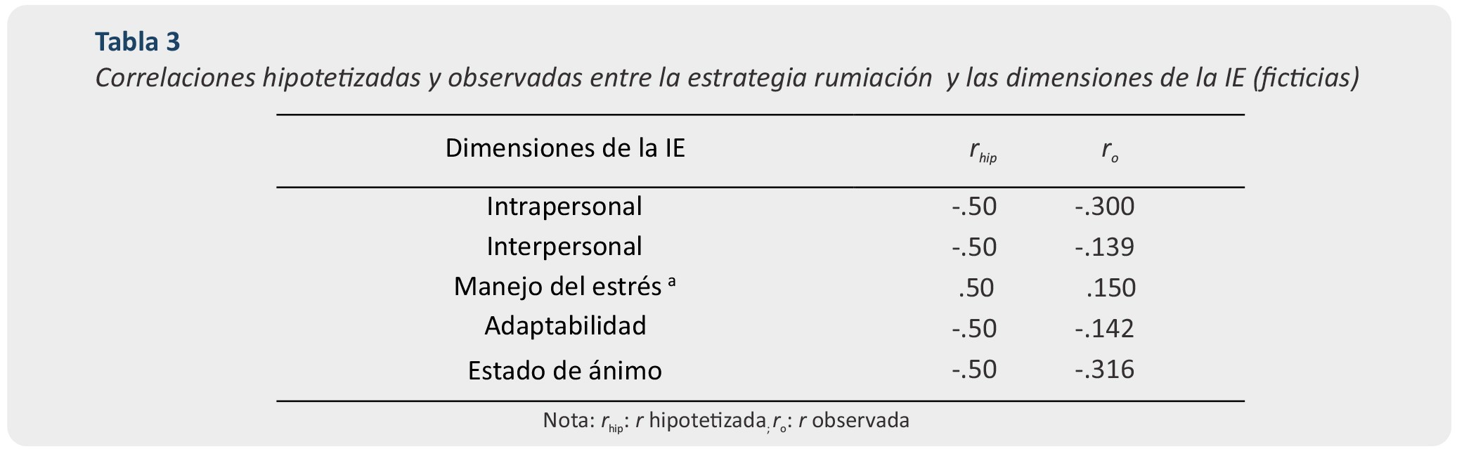 A fin de complementar la información brindada con un ejemplo ficticio y asumiendo magnitudes de ro más bajas en determinadas asociaciones (Tabla 3), quizás algunas hipótesis específicas presenten evidencia favorable (Intrapersonal y estado de ánimo), pero la hipótesis general no (Dm = .698), lo que indicaría que el patrón relacional entre rumiación e IE difiere según las facetas de esta última, pero no en el constructo general.