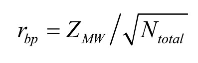 Para el caso del análisis paramétrico fue usada la correlación biserial puntual, y en cuanto al análisis no paramétrico, la ZMW fue convertida a rbp usando la ecuación de Field (2000):