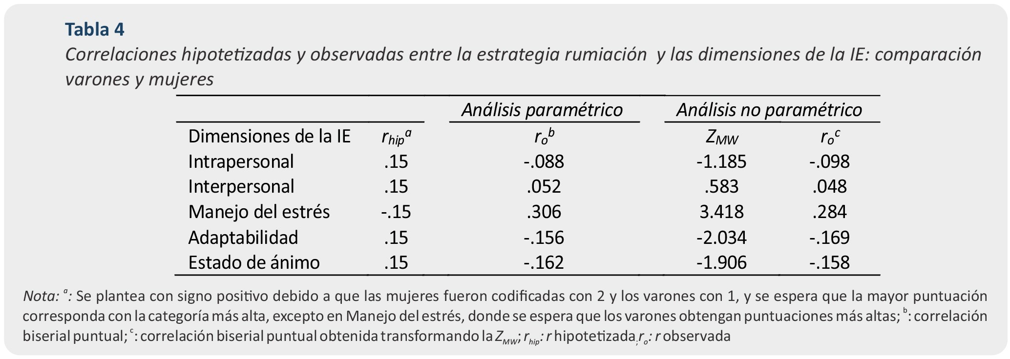 Entonces, a fin de mostrar congruencia con la información preliminar, se considera una rhip de |.15| para denotar que la diferencia esperada entre varones y mujeres no es significativa (Tabla 4).