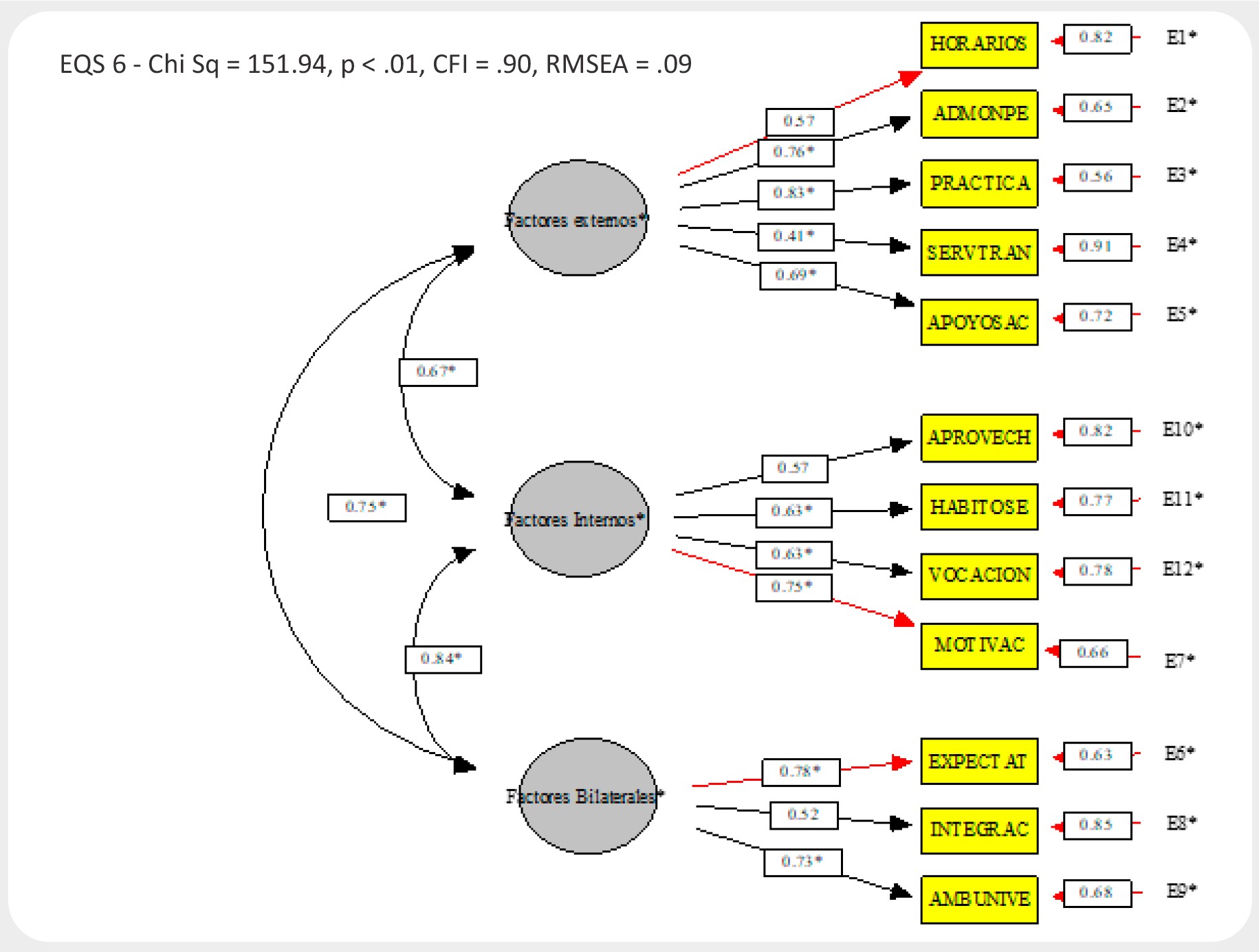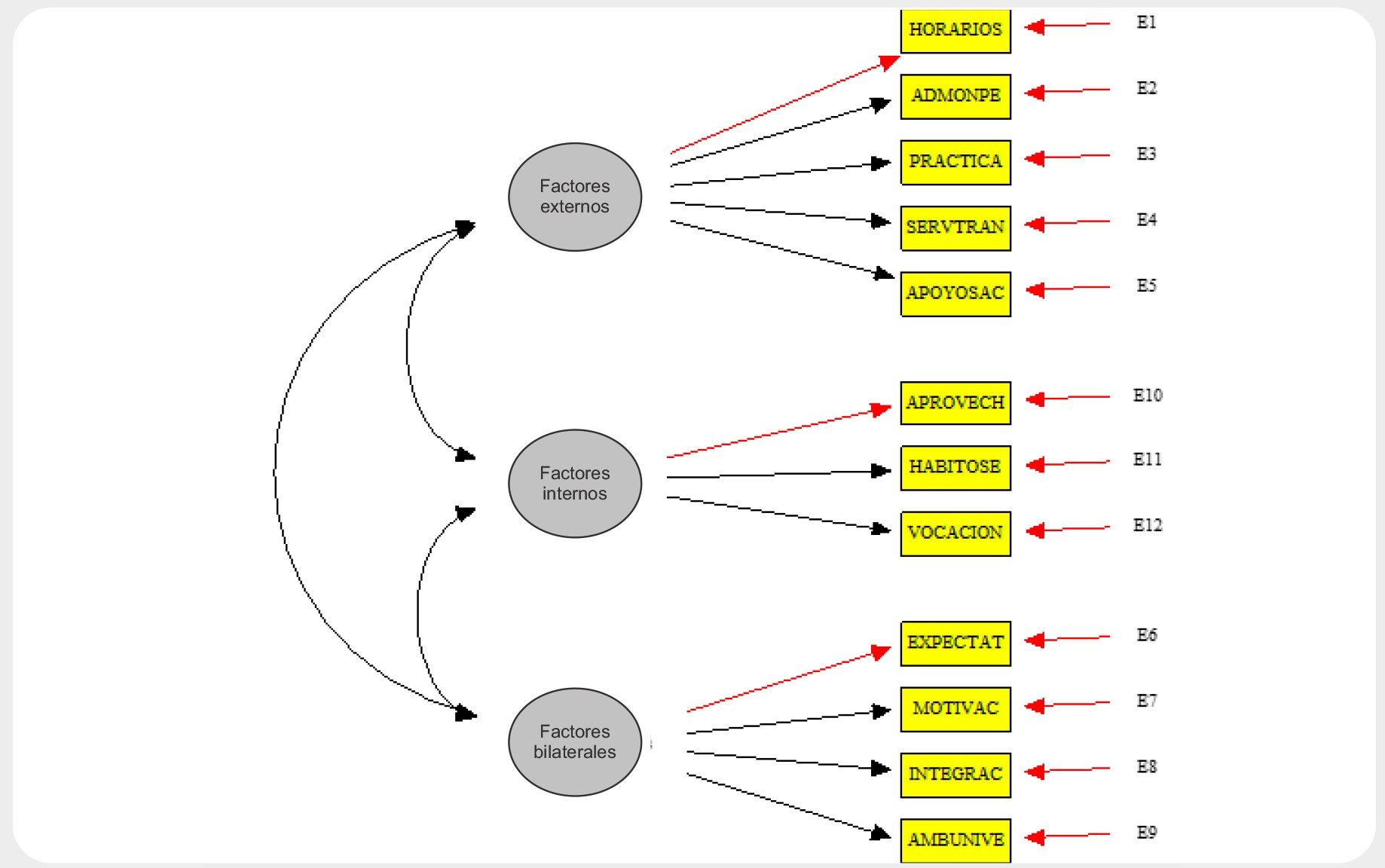 El modelo final resultante, si bien configuró tres factores acordes con el marco teórico, también mostró una reestructuración distinta de las variables manifiestas en los factores internos y bilaterales, toda vez que la variable falta de motivación que teóricamente fue considerada como parte de los factores bilaterales, resultó ser un elemento de los factores internos. Sin embargo, esta nueva configuración de variables manifiestas es pertinente, dado que la falta de motivación es una variable que hace referencia a aspectos del propio estudiante, por ello era de esperarse que esta variable conjuntamente con hábitos de estudios, bajo aprovechamiento académico, y vocacionales, conformaran un mismo factor denominado Factores Internos al Alumno.