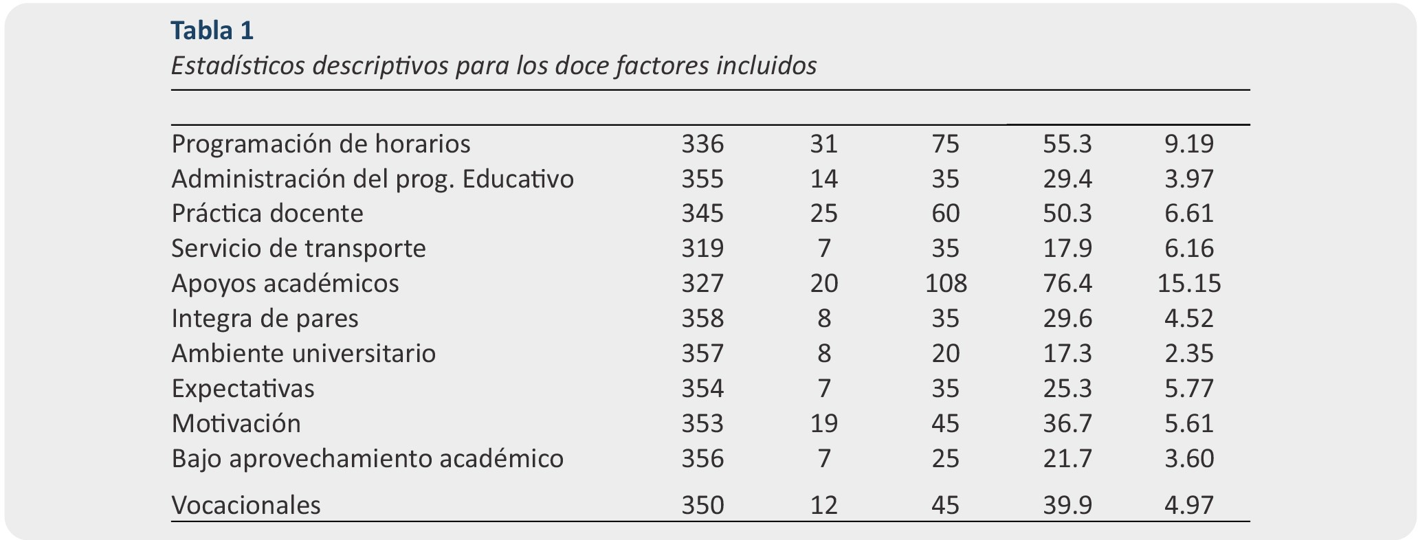 Fueron tomados doce índices agrupados en tres factores de deserción, resultantes de un análisis factorial exploratorio realizado por Álvarez (2016), con índices altos de consistencia interna por cada factor (el índice del coeficiente alpha de Cronbach varió entre entre 0.89 y 0.95 para los doce factores). El análisis previo de Álvarez fue realizado sobre la base de puntuaciones una escala tipo Likert de 1 a 5 puntos, con los tres estilos de respuestas siguientes: primer tipo de respuesta, siempre (5), la mayoría de las veces sí (4), algunas veces sí, algunas veces no (3), la mayoría de las veces no (2) y nunca (1); segundo tipo de respuesta, totalmente de acuerdo (5), de acuerdo (4), neutral (3), en desacuerdo (2), muy en desacuerdo (1); y tercer tipo de respuesta, definitivamente sí (5), probablemente sí (4), indeciso (3), probablemente no (2) y definitivamente no (1). Cada índice es la suma total obtenido para cada factor, en total fueron incluidos doce índices que corresponde con tres factores generales: