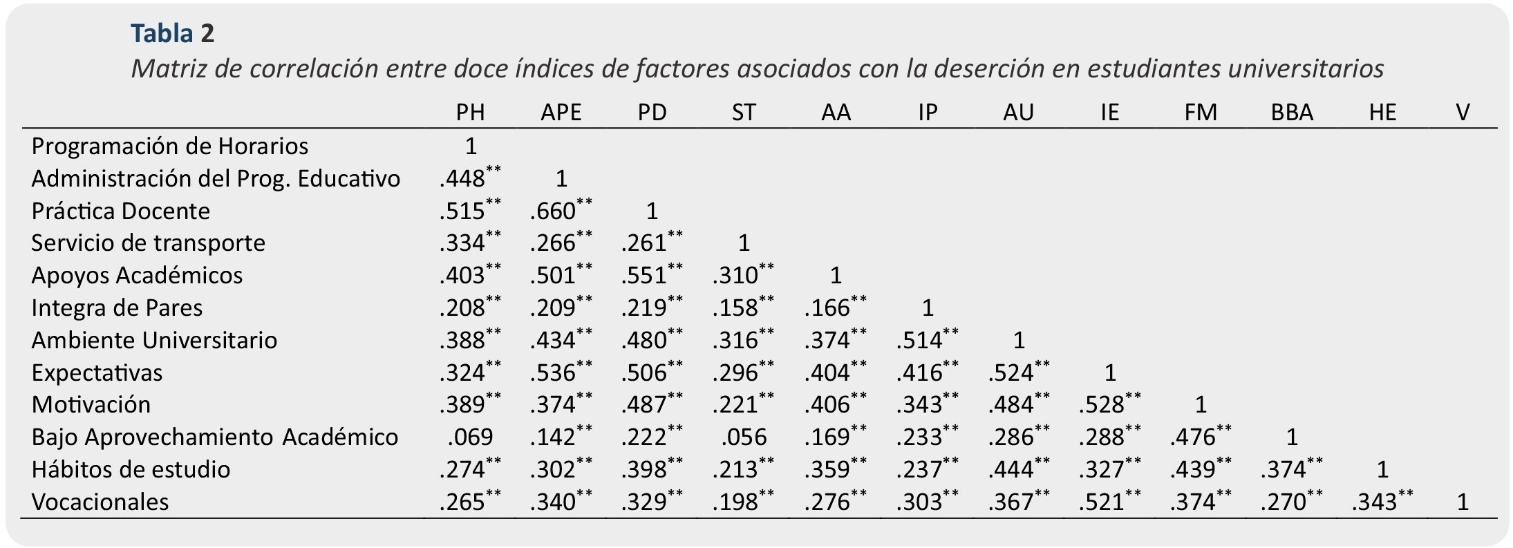 La Tabla 2 muestra la matriz de correlaciones entre los índices de los doce factores asociados con la deserción, en la cual se puede observar correlaciones significativas con excepción de dos factores (Bajo Aprovechamiento Académico con Programación de Horarios, y Bajo Aprovechamiento Académico con Servicio de transporte), y correlaciones significativas entre componentes de los factores principales de deserción.