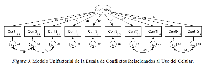 Utilizamos la misma estrategia de análisis para obtener las propiedades psicométricas de este instrumento. Los resultados mostraron una estructura unifactorial que explica el 55.67% de la varianza de los datos. Las cargas factoriales de los ítems superan el .52. Las pruebas de Kaiser-Meyer-Olkin (KMO = .87) y de Bartlett (χ2 = 1841.500 (45), p < .000) apoyaron la adecuacidad de los datos de muestreo para el análisis. Los índices de discriminación de los 10 ítems oscilaron entre .46 y .85, superando el valor mínimo recomendado por Kline (2005). A su vez, los resultados demostraron que la escala tiene una adecuada consistencia interna (α = .91). Por último, realizamos un CFA con ecuaciones estructurales utilizando el método de estimación de máxima verosimilitud con las correcciones de Satorra y Bentler (2001). Los resultados arrojaron un buen ajuste para el modelo con las correspondientes liberaciones entre errores (Byrne, 2010), χ2 = 88.02 (31) p < .001, RMSEA = .08, CFI = .97, TLI = .96, χ2 corregido = 72.87 (31) p < .001, RMSEA corregido = .07, CFI corregido = .97, TLI corregido = .96 (véase Figura 3). En la Tabla 1 se presentan las cargas factoriales de los EFA, los índices de discriminación de cada ítem, los coeficientes de regresión de los CFA y el Alfa de Cronbach de los instrumentos evaluados.