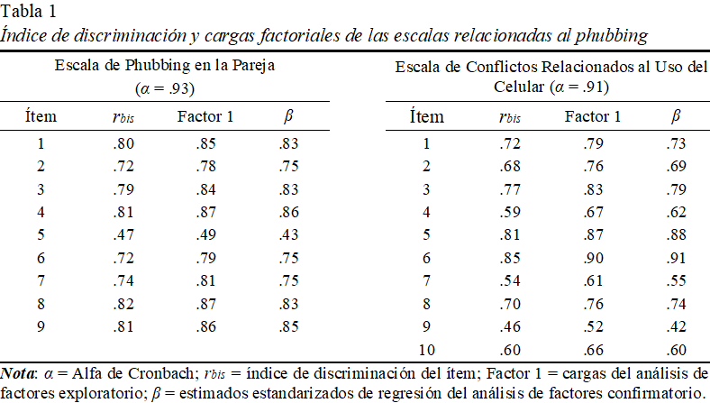 El propósito de nuestra investigación fue examinar si el uso frecuente del celular impacta negativamente la satisfacción en las relaciones románticas, el bienestar psicológico y la salud mental de los individuos que perciben phubbing por parte de su pareja. Para lograr nuestro objetivo de investigación, llevamos a cabo dos estudios independientes. En el primero examinamos las propiedades psicométricas de la Escala de Phubbing en la Pareja y la Escala de Conflictos Relacionados al Uso del Celular para su correspondiente validación en Puerto Rico. Los resultados obtenidos indican que ambas escalas poseen las propiedades psicométricas adecuadas para evaluar el fenómeno del phubbing en las relaciones románticas. Además, los índices de confiabilidad obtenidos sugieren, según lo establece Kline (2000), que los instrumentos cuentan con la suficiente consistencia interna para ser utilizada como instrumento de medición científica en futuras investigaciones en Puerto Rico y otros países hispanoparlantes. Estos resultados son congruentes con los obtenidos por Roberts y David (2016) en su validación en Estados Unidos.