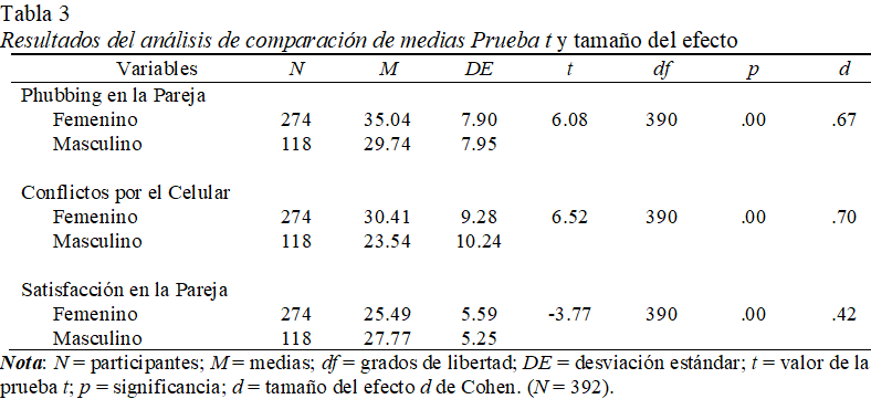Realizamos un análisis de comparación de medias prueba t con el propósito de evaluar si existen diferencias estadísticamente significativas entre las medias de phubbing en la pareja, conflictos relacionados al uso del celular y satisfacción en la pareja entre hombres y mujeres (véase Tabla 3). Los análisis reflejaron que las mujeres perciben estadísticamente más phubbing en la pareja, más conflictos en la relación causados por el uso del celular y menos satisfacción en la relación de pareja que los hombres.