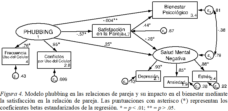 Por otra parte, el uso problemático del celular o el uso de las redes sociales genera conflictos en la pareja, que desencadena síntomas depresivos e insatisfacción, no tan solo en la relación de pareja, sino también en la vida familiar (McDaniel & Coyne, 2016). Esto se debe en su mayoría, a que el celular es un recurso que suele estar siempre presente, activo y a disposición de las personas; por ende, interfiere constantemente en la interacción de la pareja (Jarvenpaa & Lang, 2005). A su vez, varias investigaciones han encontrado correlaciones positivas entre un alto uso de la tecnología, los dispositivos electrónicos y la depresión (Adams & Kisler, 2013; Gentile et al., 2011; Pantic et al., 2012). Por estas razones, argumentamos que el phubbing en la pareja tendrá un efecto indirecto en el bienestar psicológico y la salud mental de los individuos, a través de la satisfacción en la relación de pareja.