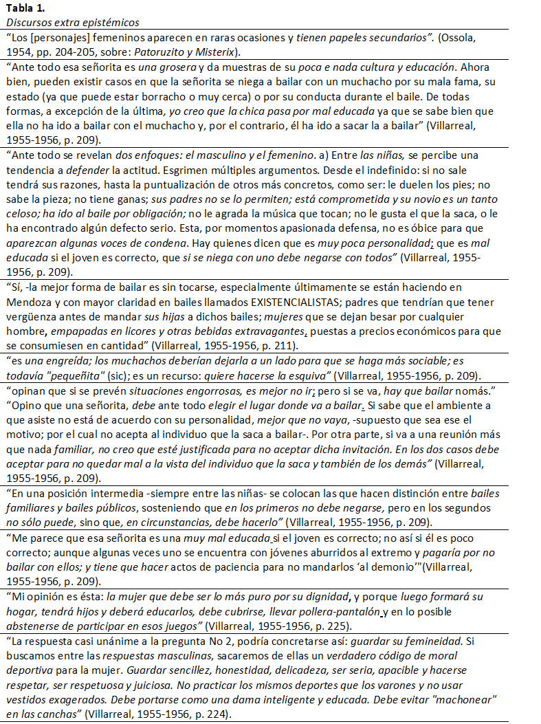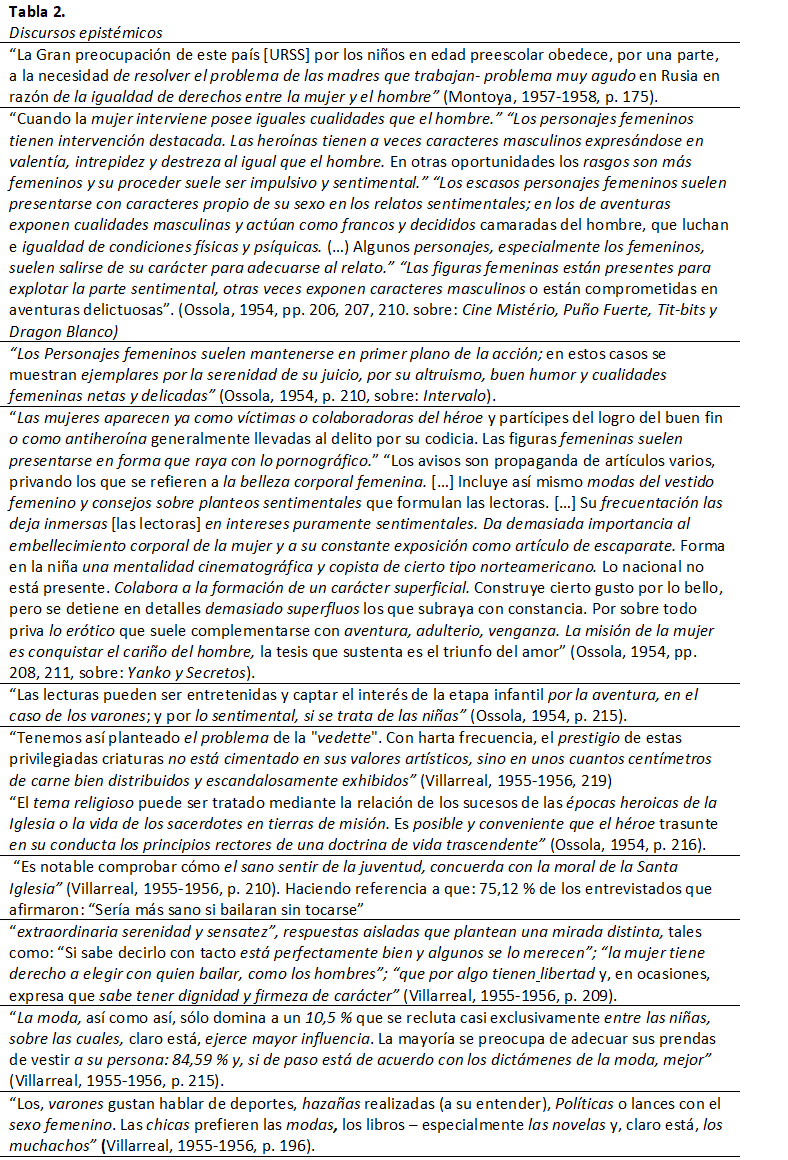De los discursos extra epistémicos presentes en el material relevado, podemos señalar, que se encuentran los siguientes mandatos a las niñas, jóvenes y mujeres: 1) debe ser: bella, subordinada al hombre y/o a la familia, honesta, delicada, seria, apacible, respetuosa y juiciosa; 2) debe estar: en desigual posición en el mercado laboral, en posición de madre, generalmente ocupando un papel secundario, vestidas a la moda y de manera moralmente establecida, bien vista por los varones y de acuerdo con la moral católica; 3) debe hacer: formar hogar, tener hijos, educar a los hijos, guardar sencillez, hacerse respetar y portarse como una dama inteligente y educada; 4) debe gustar de: novelas; 5) no debe ser: grosera y engreída; 6) no debe hacer: consumir bebidas alcohólicas, actividades físicas, en especial los mismos deportes que los varones, usar vestidos exagerados y "machonear".
