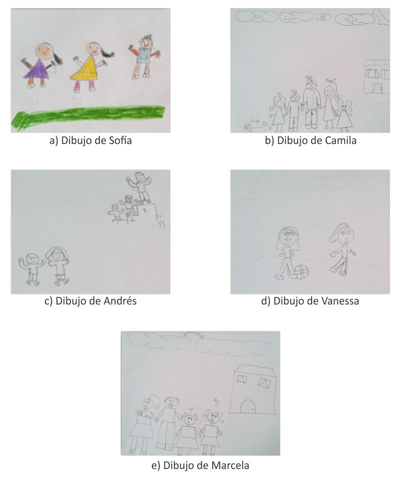 En quinto y último lugar, se muestra el dibujo de Marcela quien argumenta: “Divirtiéndonos, Vamos a comprar una casa”, se observa que Marcela se siente parte de la estructura familiar conformada por la madre, lo cual indica que se ha logrado adaptar a esta familia ensamblada. Se observa que es difícil para los niños identificar una estructura familiar unida; esto les ha generado la dificultad para reconocer qué miembros hacen parte de su estructura familiar, y la composición de los diferentes subsistemas familiares.