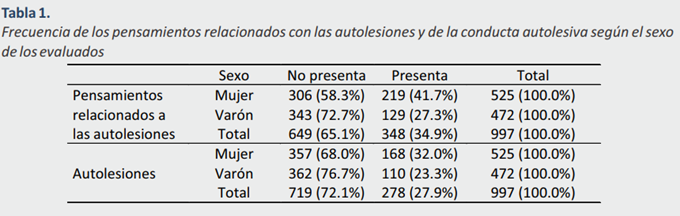 La prevalencia de pensamientos relacionados a las autolesiones en los adolescentes evaluados es de un 34.9%; mientras un 27.9 % ha llevado a cabo las autolesiones alguna vez en su vida o más y/o lo continúa haciendo (tabla 1). En ambos casos se observa que son las mujeres quienes presentan mayor riesgo y vulnerabilidad a presentar este fenómeno.