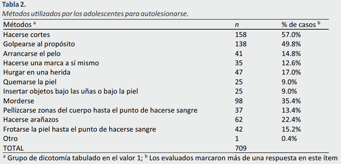 La tabla 2, muestra que los cortes en la piel o cutting (57%) constituyen el método principal que los adolescentes usan para autolesionarse. Luego, se encuentra el provocarse golpes (49.8%) o mordidas (35.4%). Además, en esta tabla se revela un dato muy importante, las personas que se autolesionan, lo hacen utilizando más de un método, es decir, pueden iniciar utilizando uno y a lo largo del tiempo pueden incorporar diversos métodos.