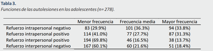 En la tabla 3, hallamos que las funciones de las autolesiones son principalmente el refuerzo intrapersonal negativo (33.8%), de modo que los evaluados refieren que se han autolesionado para deshacerse de sentimientos negativos, y el refuerzo intrapersonal positivo (31.3%) es decir por una sensación de vacío. Así también, existe un significativo porcentaje de alumnos que le asignaron importancia al refuerzo interpersonal negativo (18.4%), por ende los evaluados se han autolesionado para evitar hacer algo o escapar de algo/alguien. Asimismo, el refuerzo interpersonal positivo (13.7%), de modo que las autolesiones ocurrían para comunicarse o conseguir su atención de alguien.