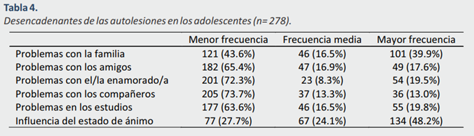 En la tabla 4, se observa que el desencadenante más frecuente de las autolesiones es la influencia del estado de ánimo negativo como puede ser la tristeza, el enojo, la frustración o un estado ansioso (48.2%). Asimismo se observa que otro importante activador de las autolesiones son los problemas en el ámbito familiar (39.9%).También, se halla que los problemas en los estudios (19.8 %), con el enamorado/a (19.5%) o con los amigos (17.6%) pueden ser desencadenantes de las autolesiones.