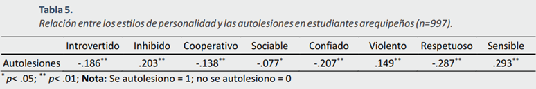 Resumen: Esta investigación tuvo como objetivo determinar la relación entre los estilos de personalidad y las autolesiones. La muestra fue de 997 estudiantes entre los 13 y 18 años de edad (M=15.24 años), que cursaban entre tercero y quinto de secundaria en colegios estatales y privados de la ciudad de Arequipa. El diseño de investigación fue del tipo transversal, descriptivo – correlacional. Se utilizaron el Inventario de Estilos de Personalidad para Adolescentes de Millon (MAPI), la Sub-Escala de Autolesiones y Pensamientos Autolesivos y una ficha sociodemográfica. Los resultados indicaron que existe una prevalencia de 34.9% en relación a pensamientos autolesivos, mientras un 27.9% de los evaluados se ha autolesionado, siendo la edad promedio de inicio de las autolesiones los 12.61 años. Los principales desencadenantes son estados de ánimo negativos (48.2%) y los problemas familiares (39.9%). Así mismo, hallamos que los estilos de personalidad sensible (r= .293; p< .001), inhibido (r= .203; p< .001), violento (r= .149; p< .001) son los que más se asocian con las conductas autolesivas. Se concluye que los estilos de personalidad sensible, inhibido y violento están ligados a una mayor prevalencia de las autolesiones en adolescentes de la ciudad de Arequipa