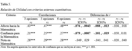 2) las evidencias de validez basadas en la relación entre el constructo Utilidad con otras variables externas.