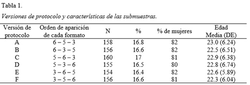 Posteriormente se generaron seis versiones del protocolo (A a F) en las que se modificaba únicamente el orden de aparición de los tres formatos de respuesta a la escala de Utilidad. Con el fin de controlar el efecto de esta variable se aleatorizó la asignación de las diferentes versiones a los individuos durante la administración. Cada versión fue respondida por submuestras de tamaño similar y que conservaban las características sociodemográficas de la muestra total (tabla 1).