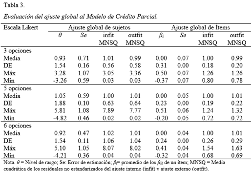 A fin de alcanzar mayor capacidad descriptiva se inspeccionaron los valores infit y outfit de cada sujeto. Para la escala Likert de seis opciones los porcentajes de sujetos por fuera del intervalo de ajuste aceptable según Linacre (2012) son de 20.2% y 19.8% para infit y outfit respectivamente. Estos porcentajes de sujetos con patrones desajustados disminuyen a 16.7% y 17.3% cuando se aplica una escala de cinco categorías y a 14.3% y 13.4% si la escala Likert tiene tres opciones.