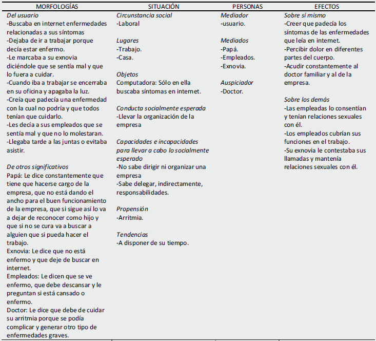 De acuerdo con la información recabada en la entrevista con el usuario, él empezó a interpretar como enfermedades graves varios de los síntomas que sentía o de los signos que veía en su cuerpo, a partir de que su padre le dijo que ya no podía seguir con su vida de fiesta y de falta de obligaciones. Precisamente, dado que el usuario ya había terminado sus estudios, no tenía trabajo, seguía viviendo en casa y bajo la manutención de sus papás, y porque frecuentemente iba fiestas y centros nocturnos, es que su padre le creó una empresa y dejándolo a él a cargo, no sin antes advertirle que si no era capaz de “sacar adelante” tal empresa lo dejaría de reconocer como su hijo, ya que estaba fastidiado de “estar manteniendo un inútil”.