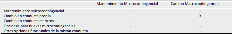 El siguiente paso del análisis contingencial lo comprende el análisis macrocontingencial, el cual, como se mencionó líneas arriba, es el análisis del contexto valorativo de la interacción analizada en el paso anterior, en términos de la correspondencia entre las prácticas sustitutivas y efectivas intra-individuo (i.e., entre lo que cree y hace el usuario) y entre-individuos (i.e., entre lo que valora y hace el usuario respecto de lo que valoran y hacen las personas significativas con las que se relaciona; tanto a nivel situacional (i.e., en la microcontingencia bajo estudio) como ejemplar (i.e., microcontingencias en las que se hicieron explícitos ciertos valores como un deber ser del comportamiento del individuo en ciertas situaciones).