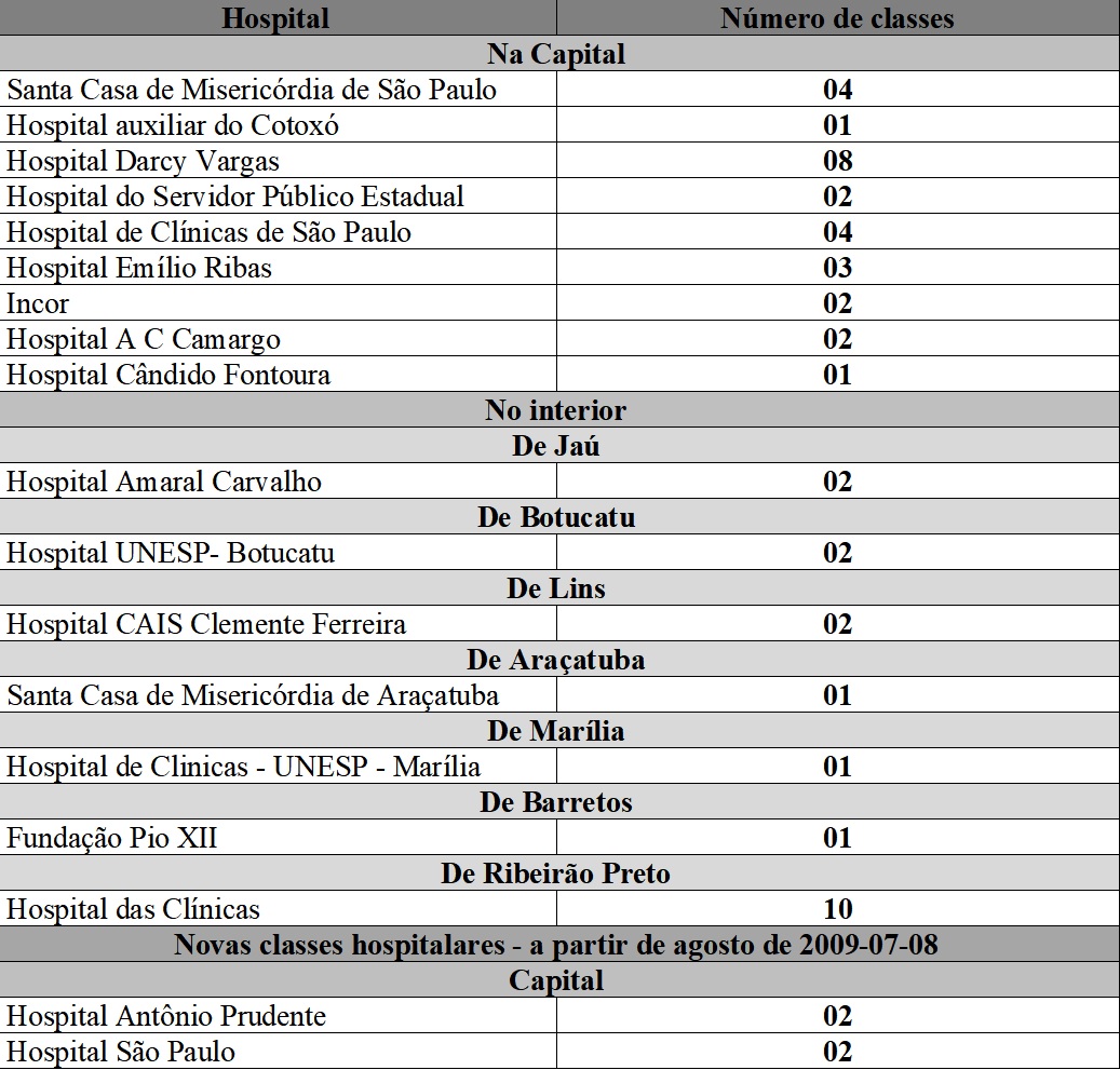 De acordo com os dados da Secretaria da Educação do Estado de São Paulo (2009, p. 01) as Classes hospitalares existentes são: