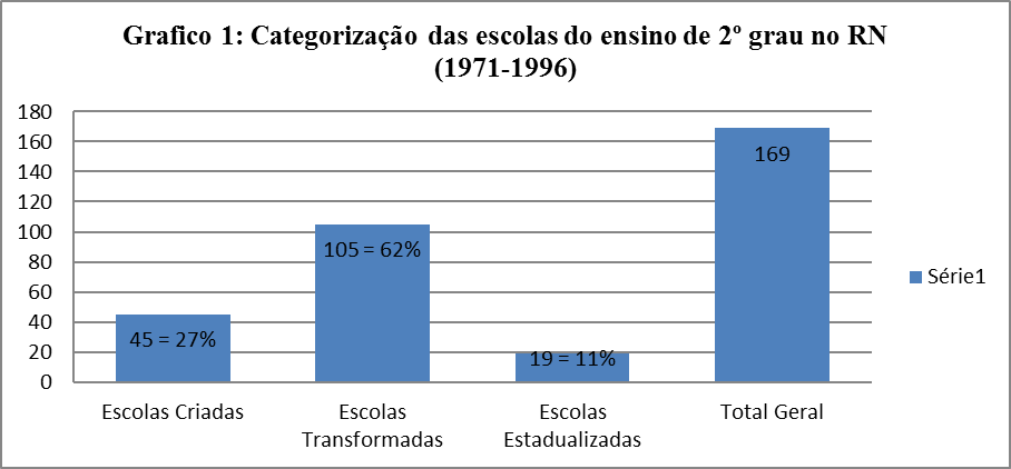 Ao todo constatou-se a existência de 169 (cento e sessenta e nove) escolas no estado do RN que forneceram o ensino de 2º grau, e elas foram sendo criadas, transformadas ou estadualizadas ao longo de vinte e cinco anos, entre o período de 1971 e 1996. É bem verdade que o ensino técnico profissionalizante foi previsto na Lei n. 5.692/71 para ser implantado de forma gradual, de acordo com a disponibilidade dos recursos materiais, humanos e didáticos, conforme disposto no Art. 72.