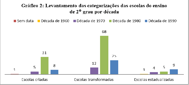 Ao analisar a implantação do ensino de 2° grau por décadas constata-se que o período de 1980 foi o que trouxe maior expansão desse nível de ensino. No que concerne às categorias, averigua-se que o grupo “escolas transformadas” foi a mais privilegiada, demonstrando uma regularidade no que diz respeito a sempre ser a de maior número quando relacionada às outras duas categorias, independente da década observada.