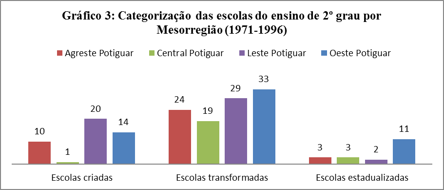 Dessa forma, resumidamente, os resultados parciais da pesquisa indicam três categorias de escolas existentes no período: as criadas, as transformadas e as estadualizadas. Também se pode constatar que o estado do RN teve escolas de ensino de 2° grau em todas as suas quatro mesorregiões, assim como ainda se verifica que a distribuição dessas instituições de ensino não manteve um critério explicito ou inerte. O que se averigua é um maior número de escolas concentradas nas regiões mais urbanizadas e nas proximidades da capital do estado.