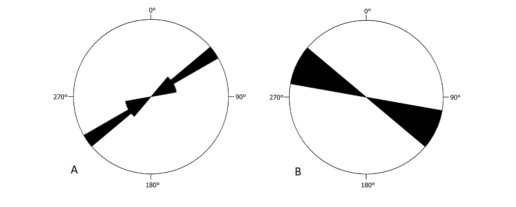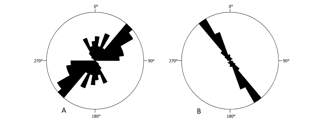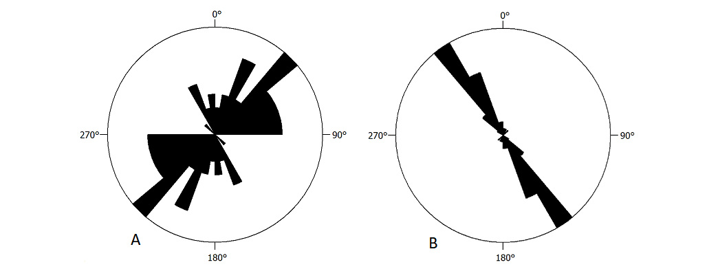 Assim, sob a perspectiva estrutural, esses litotipos exibem planos de foliação bem desenvolvidos, ondulados, formando localmente uma dobra fechada, com dimensão métrica. Quando tratados em software para análise estrutural verifica-se que os planos de foliação (n = 52) exibe direção principal N40-50E, com direção secundária N20-30E (Figura 5A). Já os planos de fratura (n = 39) apresentam direção principal N30-40W (coincidente com a direção da ravina) e secundária e N20-30W (Figura 5B).
