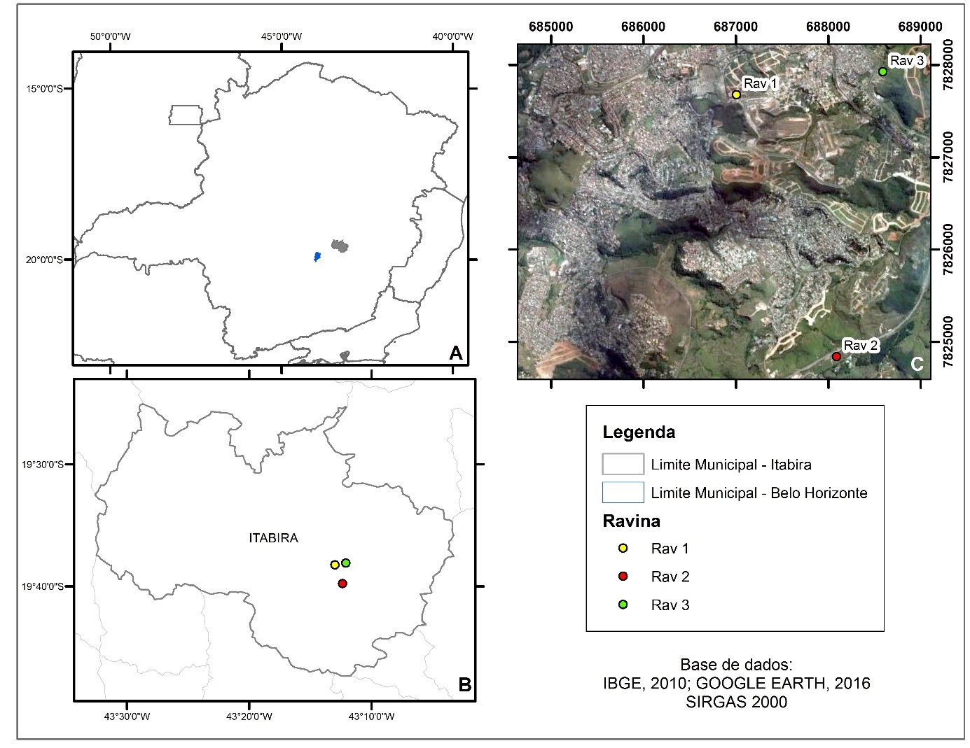 Para o desenvolvimento desta pesquisa foram escolhidas três ravinas (Figuras 1B e 1C), localizadas nos bairros Colina da Praia (Rav 1), Ribeira de Baixo (Rav 2) e Praia (Rav 3), situadas na área urbana do município de Itabira, o qual está situado na porção nordeste do Quadrilátero Ferrífero, a oeste de Belo Horizonte (MG), distando deste cerca de 100km (Figura 1A).