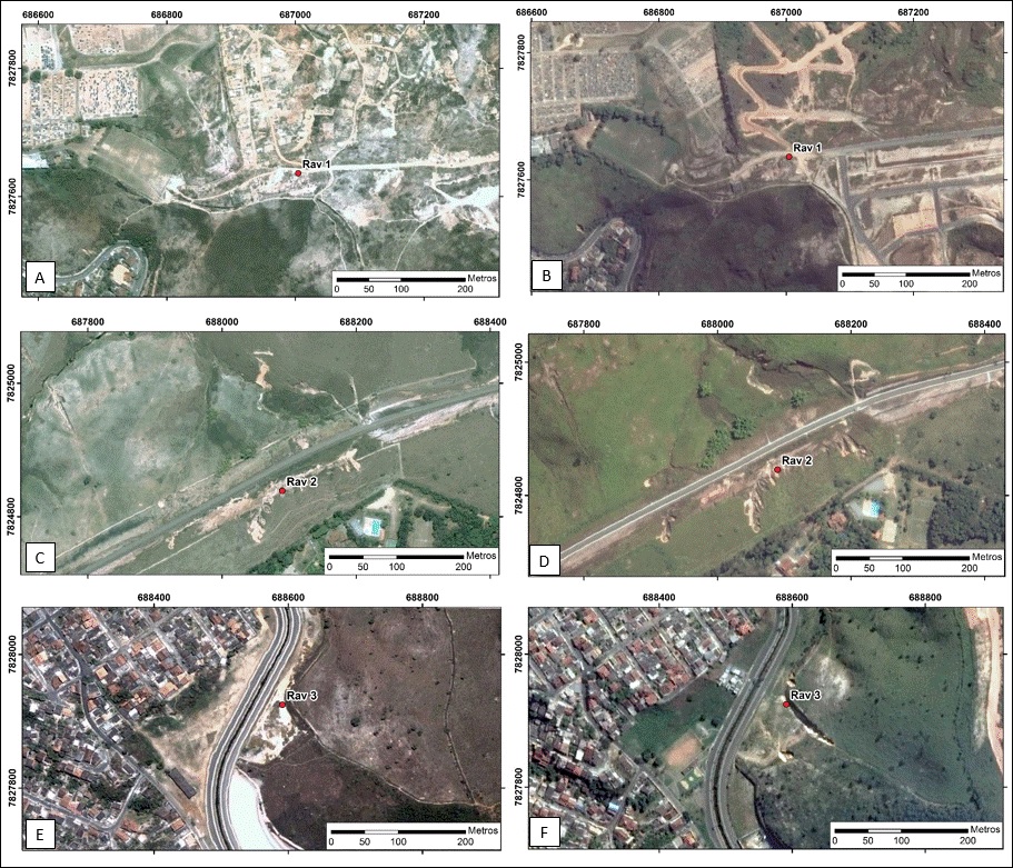 A partir da análise de imagens de satélite obtidas no Google Earth, verifica-se, na região da Rav 1, no ano de 2005 (Figura 2A), a ocupação desordenada da região, com remoção da cobertura vegetal para a construção de casas e abertura de acessos. Além disso, destacam-se, em branco, áreas com solo exposto, locais que podem ter o desenvolvimento acelerado de processos erosivos.