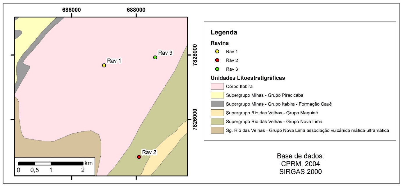 Sob a perspectiva geológica regional, de acordo com dados do Serviço Geológico do Brasil - CPRM (2004), a região das ravinas (Figura 3) é constituída por rochas associadas ao Grupo Nova Lima (Rav 2) e à Suíte Borrachudos - Corpo Itabira (Rav 1 e Rav 3).